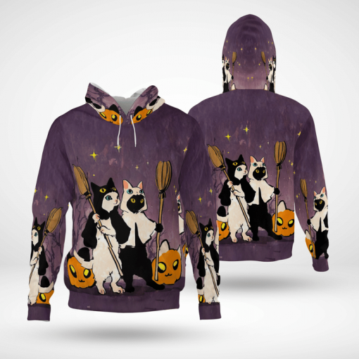 Black And White Cats Witches Pumpcat Purple Halloween 3D All-Over Print Unisex Hoodie