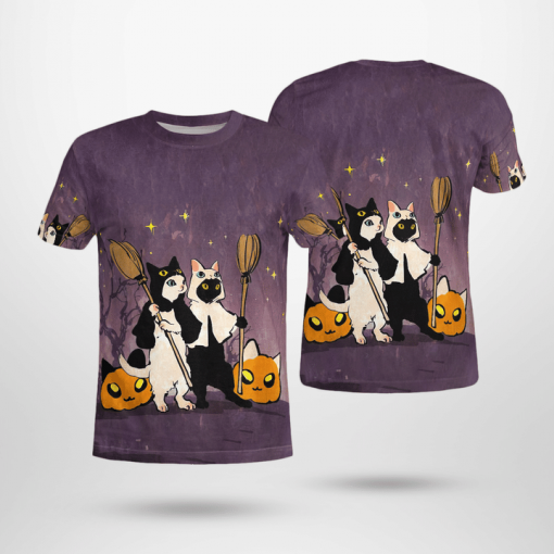 Black And White Cats Witches Pumpcat Purple Halloween 3D All-Over Print Unisex T-Shirt