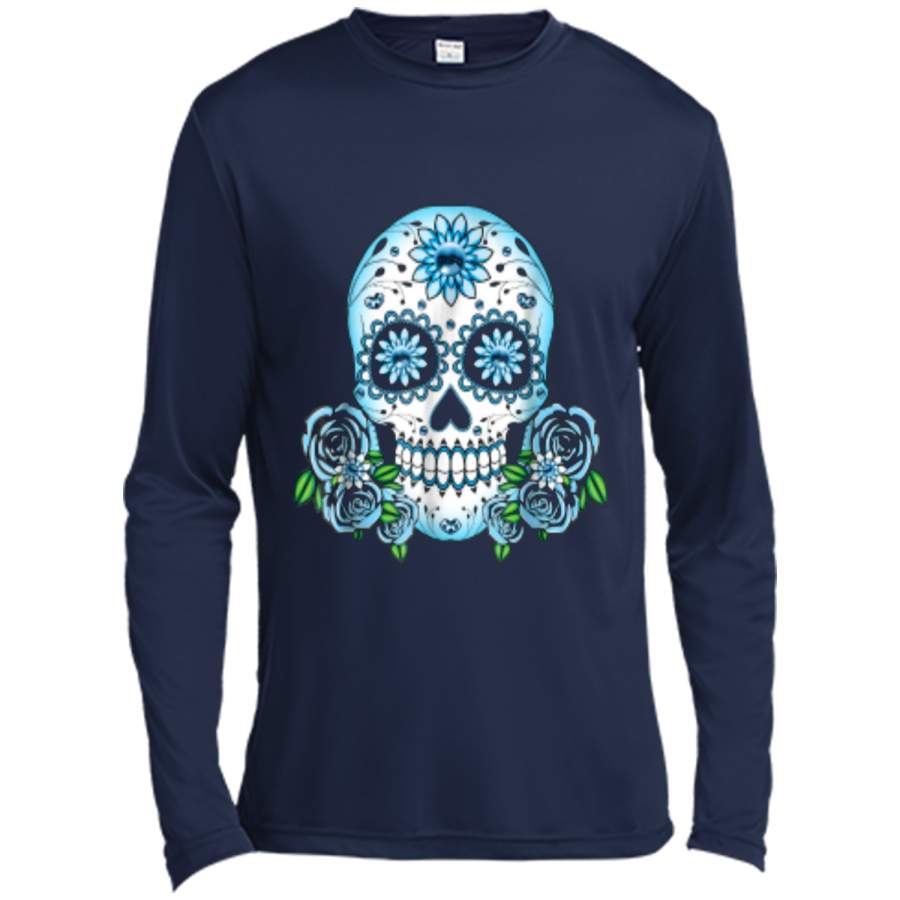 Blue Flowers Sugar Skull Day Of The Dead Halloween Long Sleeve Moisture Absorbing Shirt