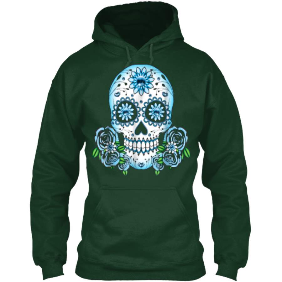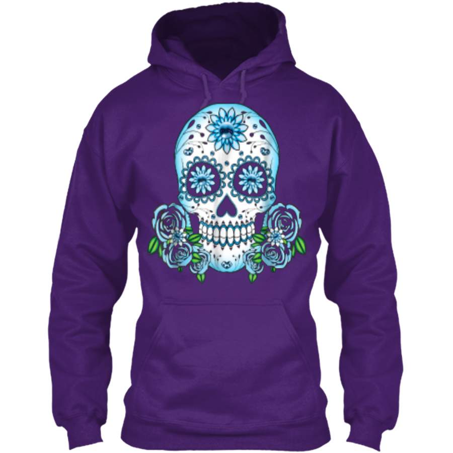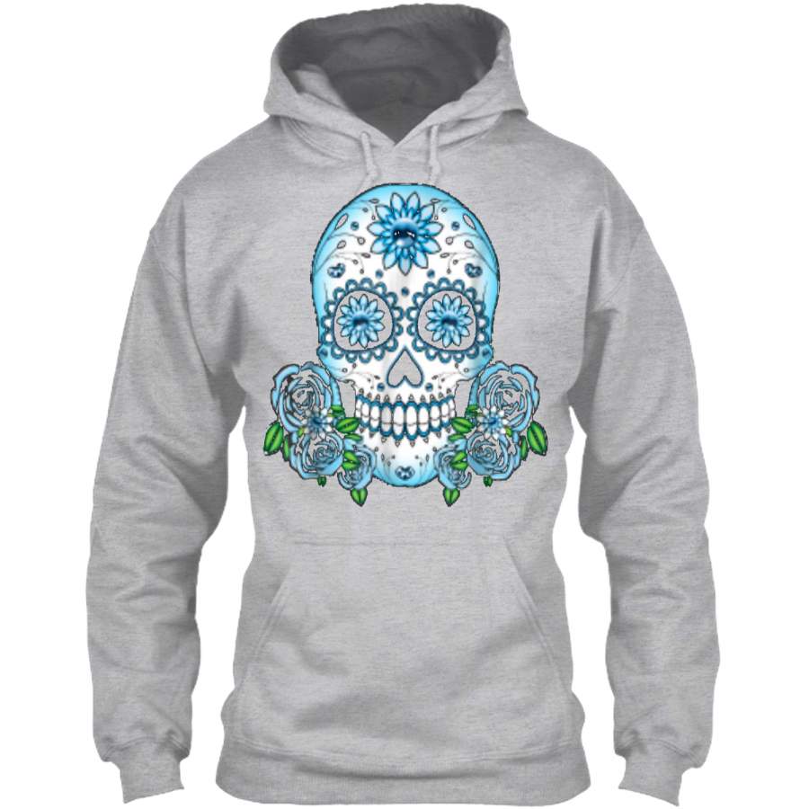 Blue Flowers Sugar Skull Day Of The Dead Halloween Pullover Hoodie 8 oz
