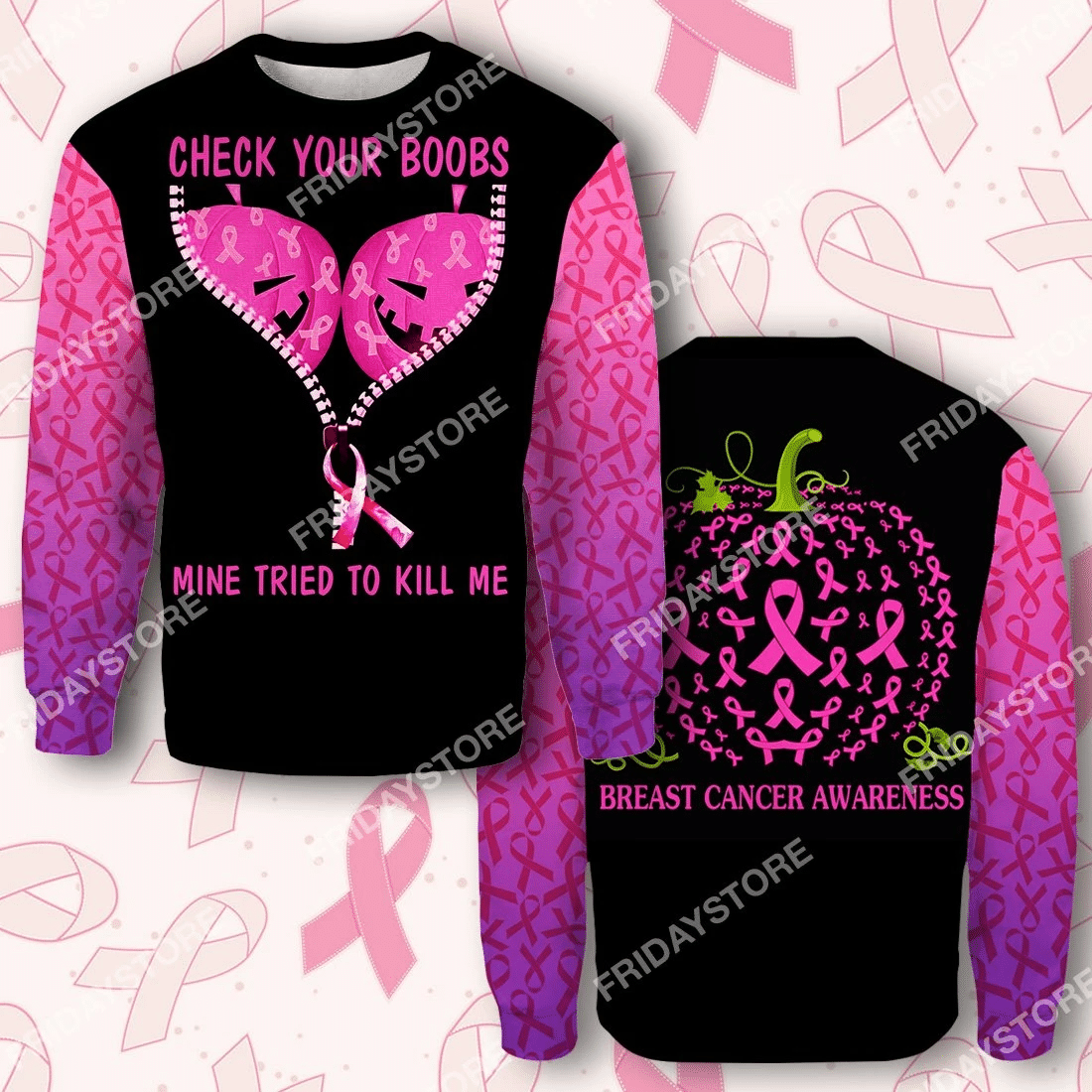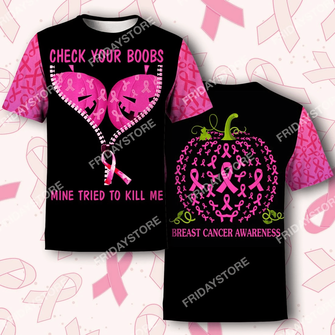 Breast Cancer T-Shirt Breast Cancer Check Your Boobs Mine Tried To Kill Me Halloween Pink T-Shirt Hoodie Adult Full Print