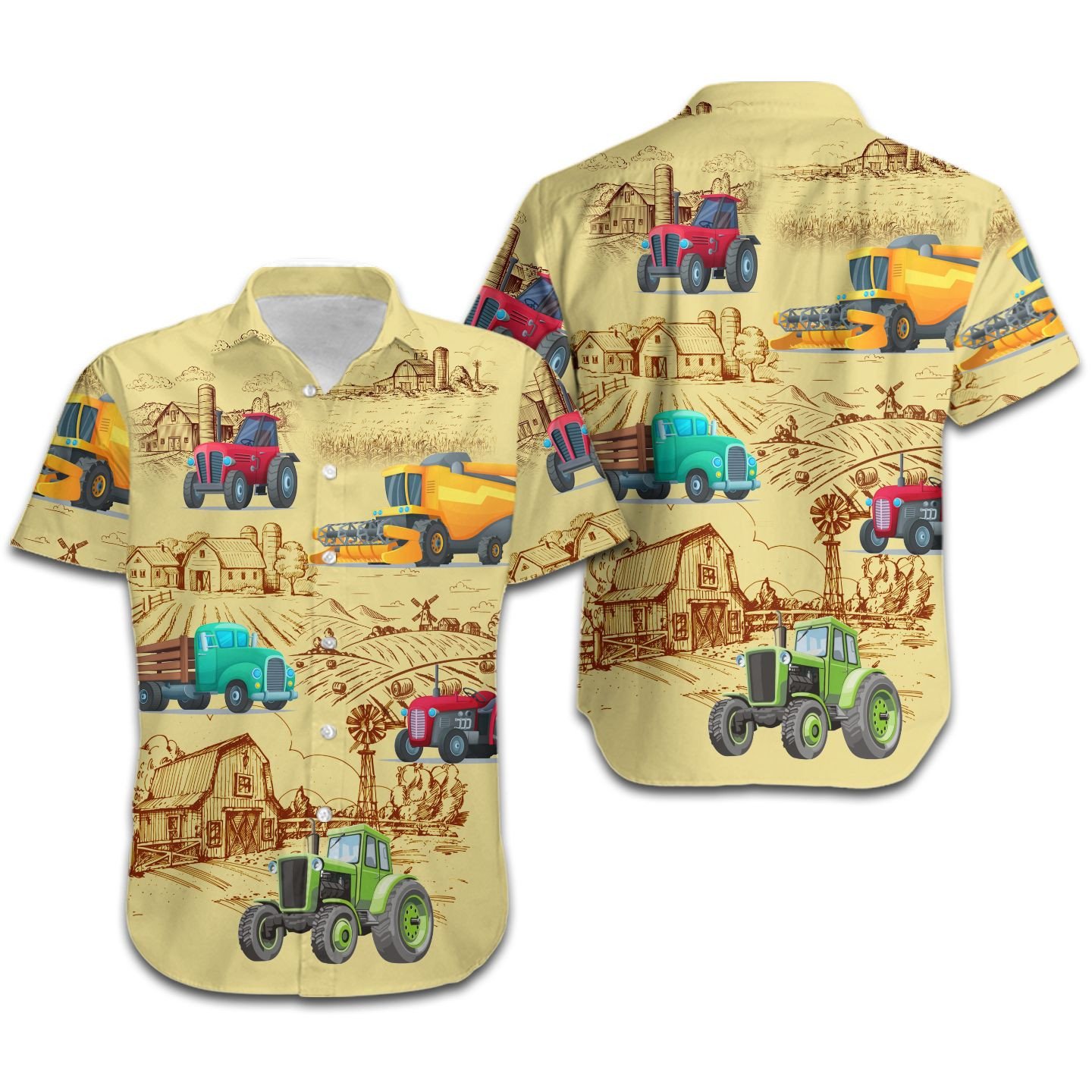 Farmer Tractor Field Farm Image Background Men Button Up Hawaiian Shirt For Farm Lovers In Daily Life Unique Gifts