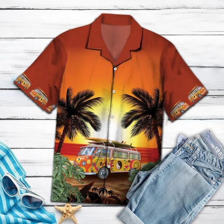Hippie Bus Under Sunset Palm Tree Beach 3D Hawaiian Shirt