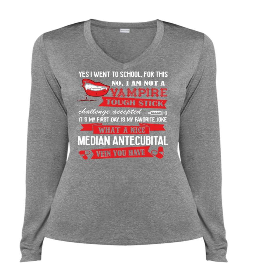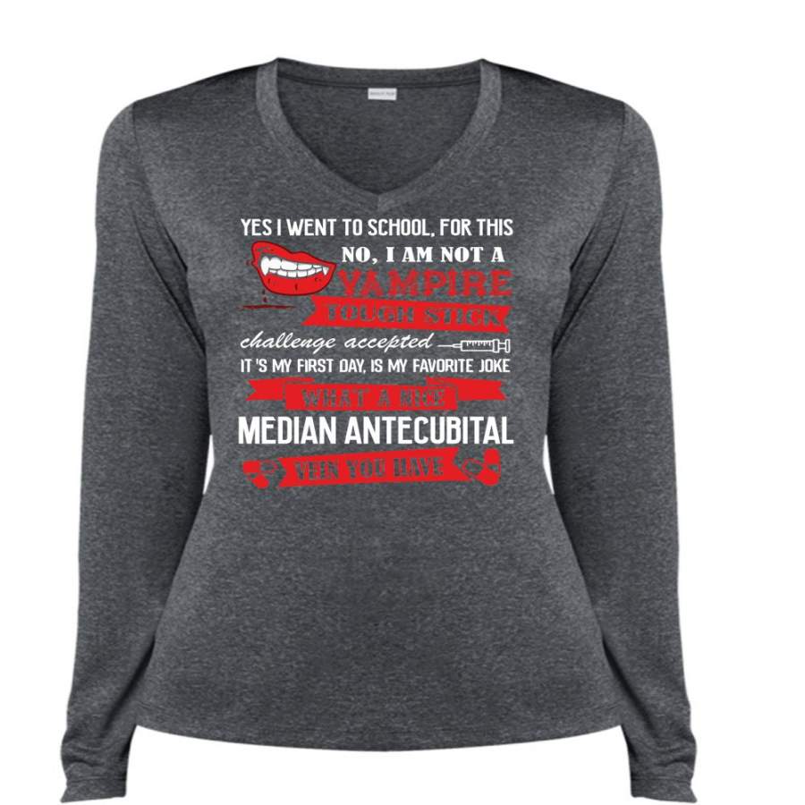 I Am Not A Vampire Tough Stick T Shirt, Median Antecubital Vein You Have T Shirt, Cool Shirt (Ladies LS Heather V-Neck)
