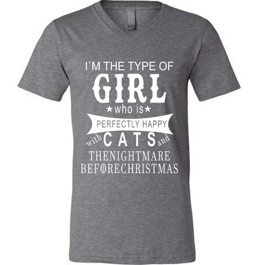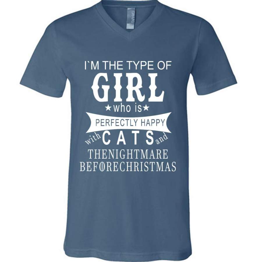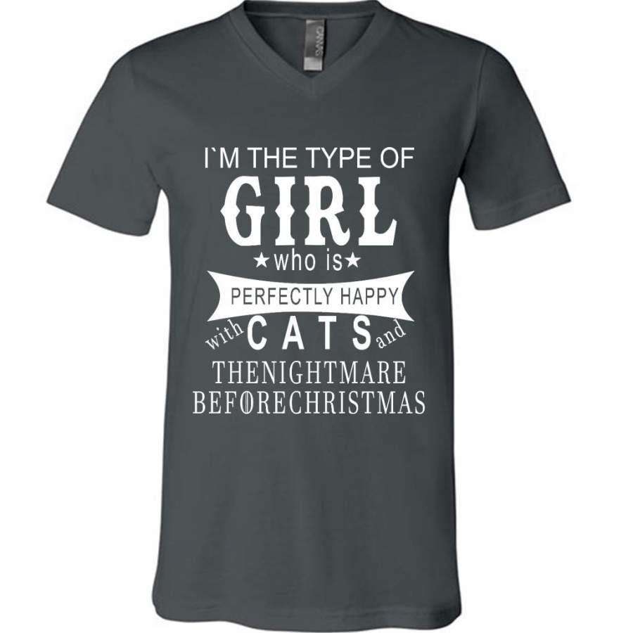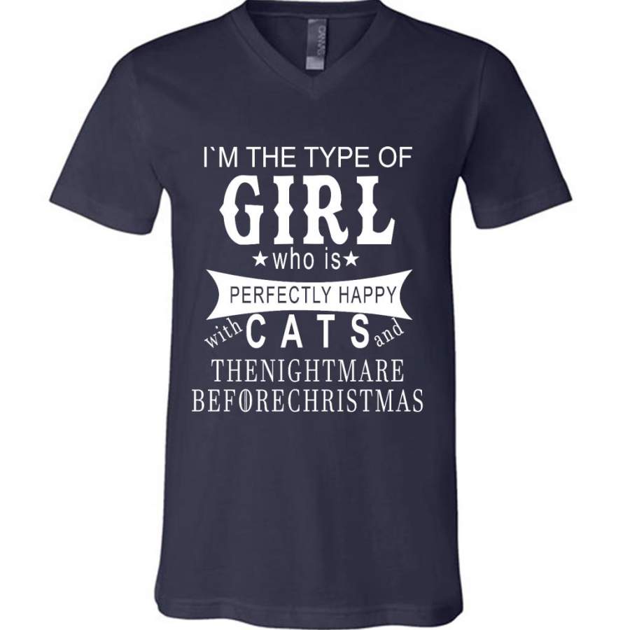 I’m The Type Of Girl Who Is Perfectly Happy With Cats And The Nightmare Before Christmas – Canvas Unisex V-Neck Shirt