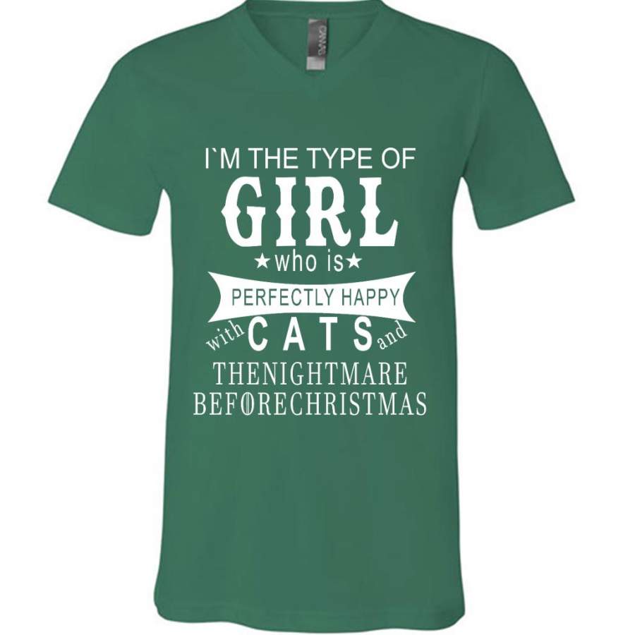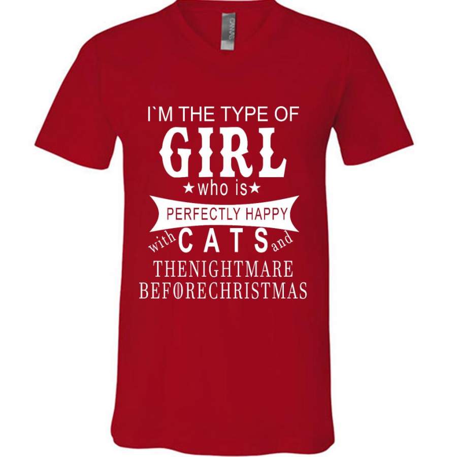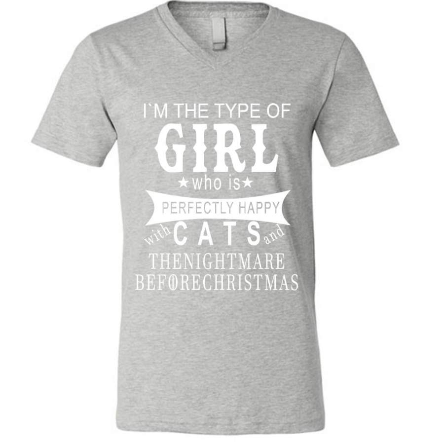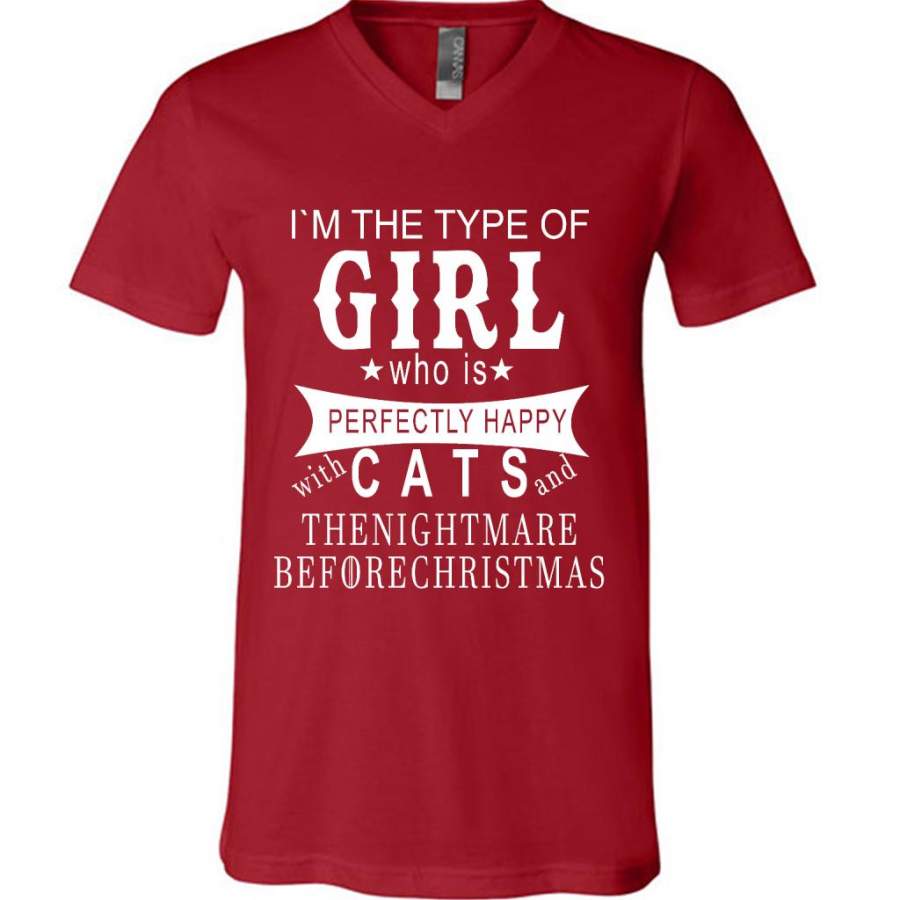 I’m The Type Of Girl Who Is Perfectly Happy With Cats And The Nightmare Before Christmas – Canvas Unisex V-Neck Shirt