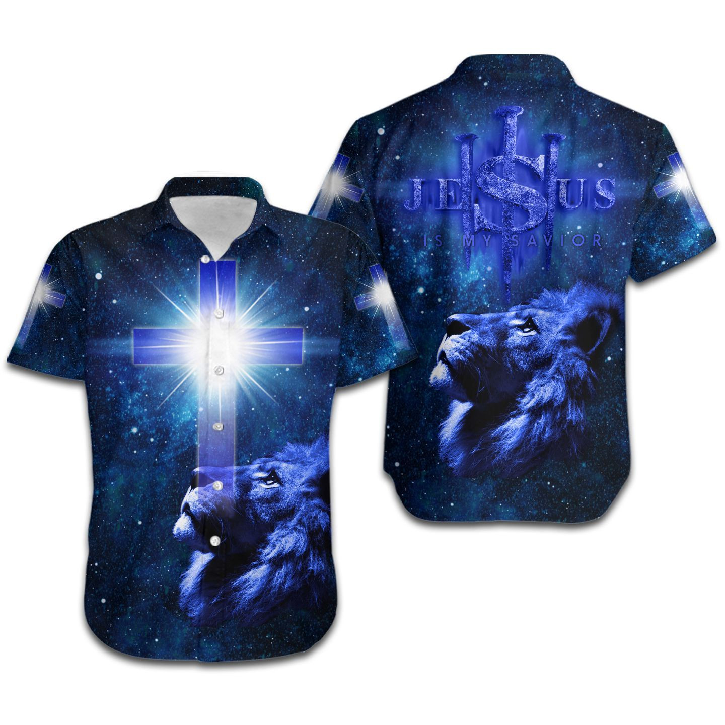 Jesus Is My Savior Cross And Lion Galaxy Background Women Button Up Hawaiian Shirt For God Lovers In Summer And Daily Life – Gift For Lion Lovers