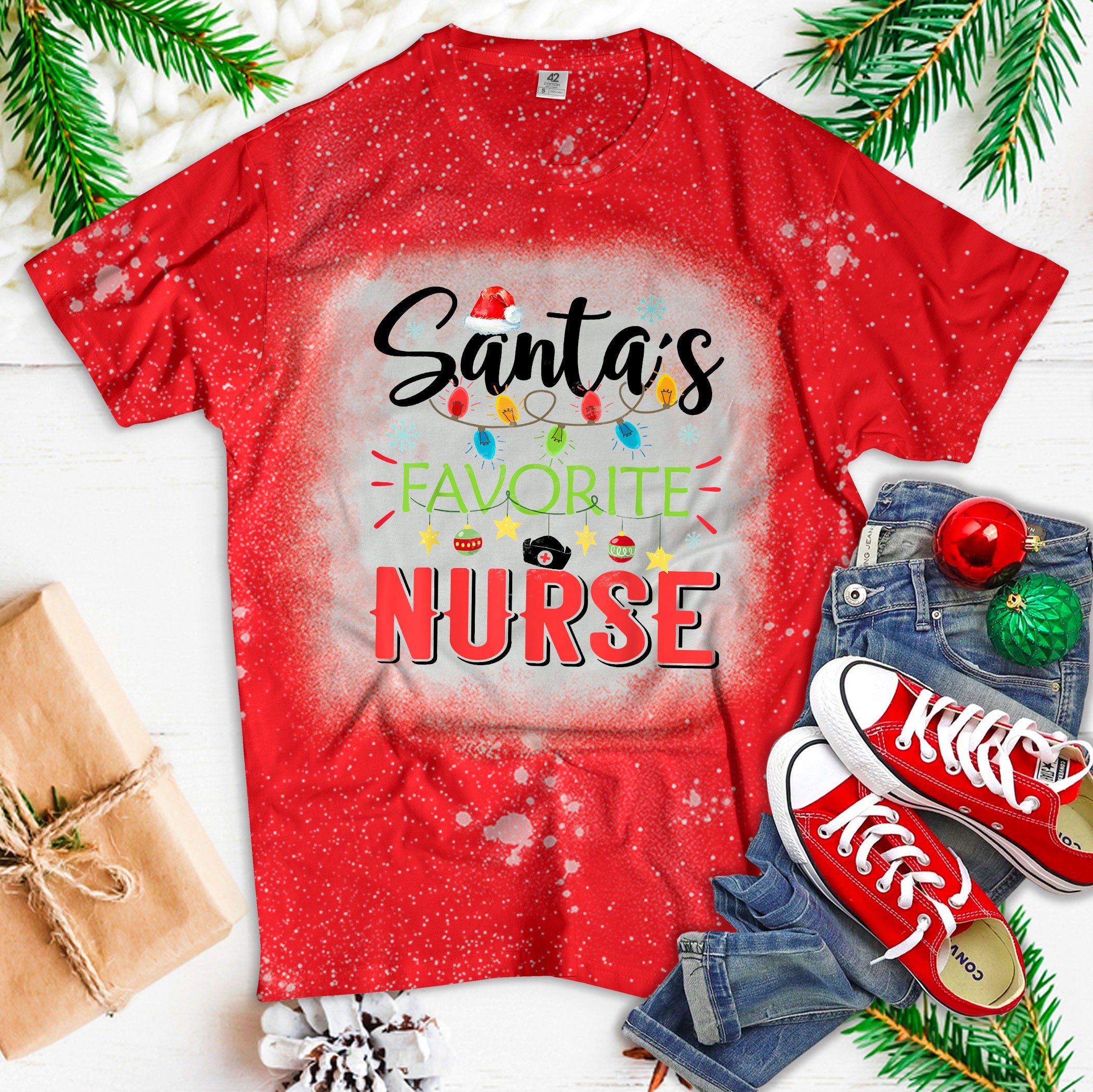 Santa’S Favorite Nurse Xmas Light Santa Hat Christmas Gift Bleached T Shirt For Men Women