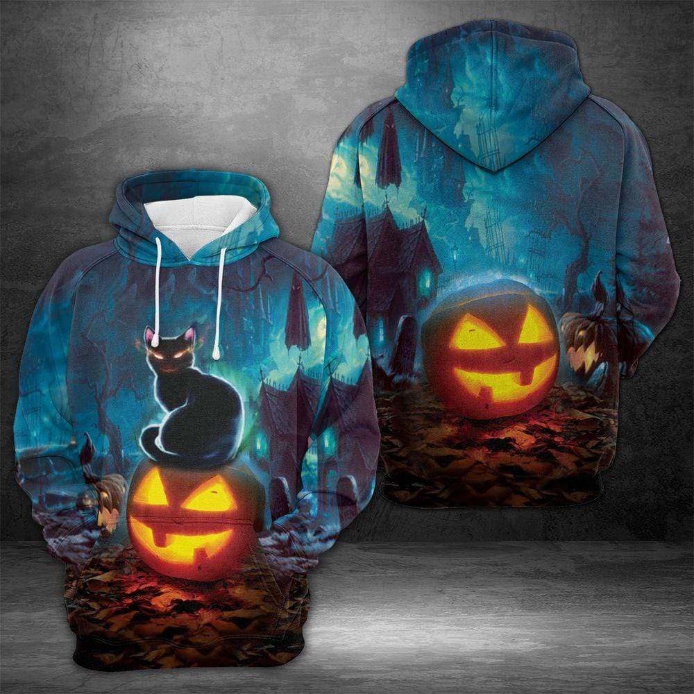 Scary Black Cat Evil Pumkin Halloween Blue 3D All-Over Print Unisex Hoodie