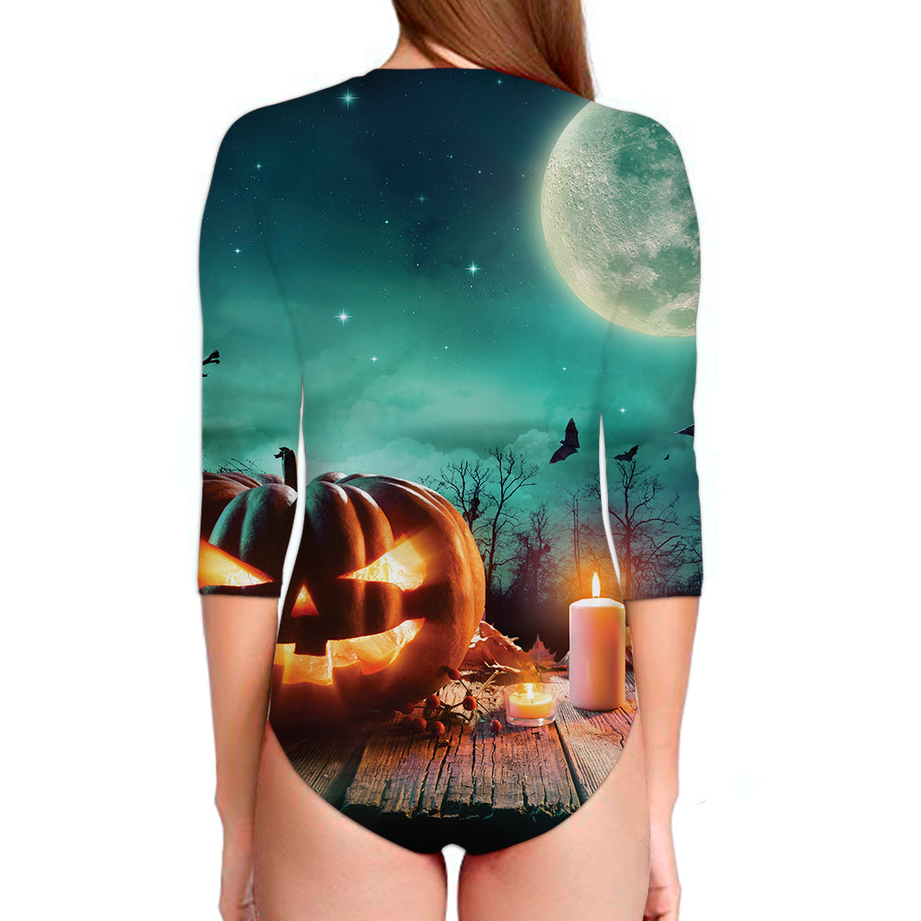 Scary Halloween Pumpkin Print Long Sleeve One Piece Swimsuit