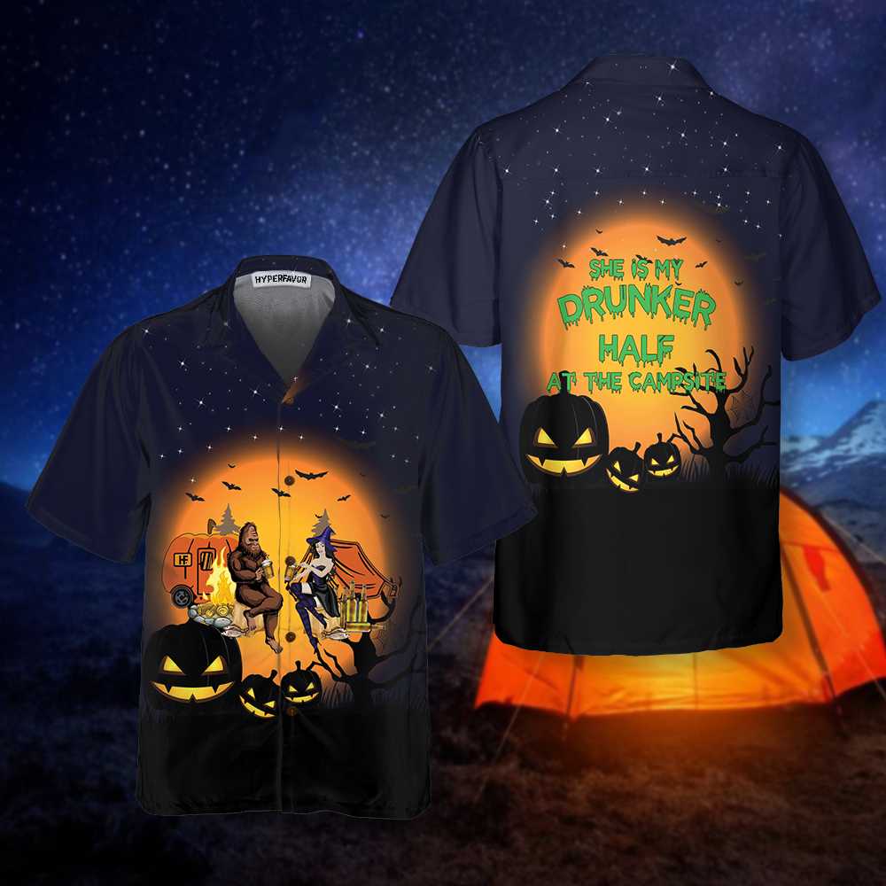 She Is My Drunker Half At The Campsite Camping Hawaiian Shirt, Halloween-Themed Shirt For Camping