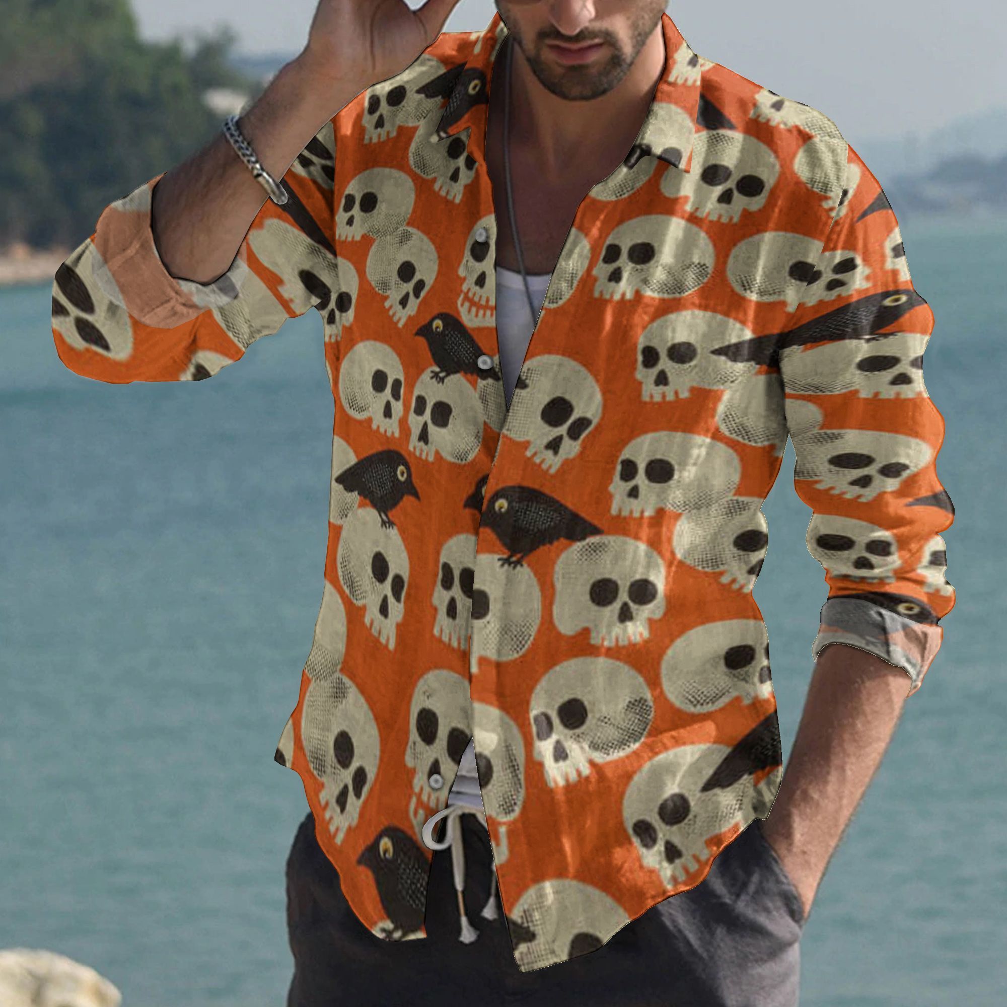 Skeleton Skull Cotton And Linen Casual Shirt, Halloween Skull Linen Shirt