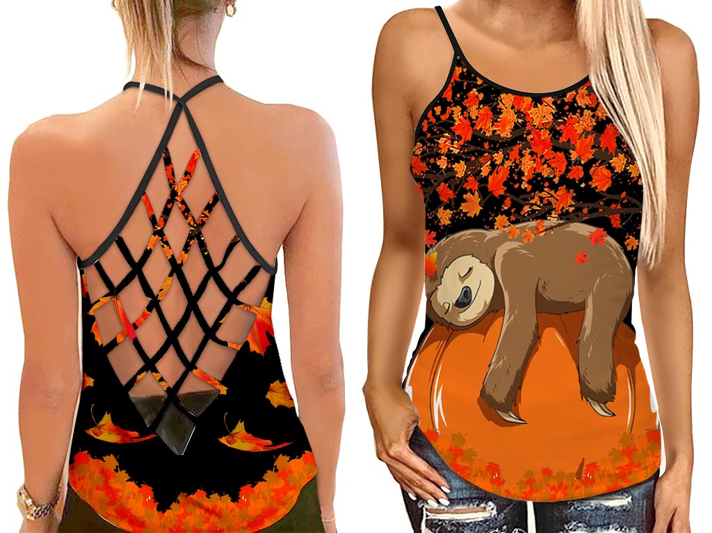 Sloth Hug Pumpkin Halloween Tank Top Shirt Women – Autumn Cross Open Back Camisole Tank