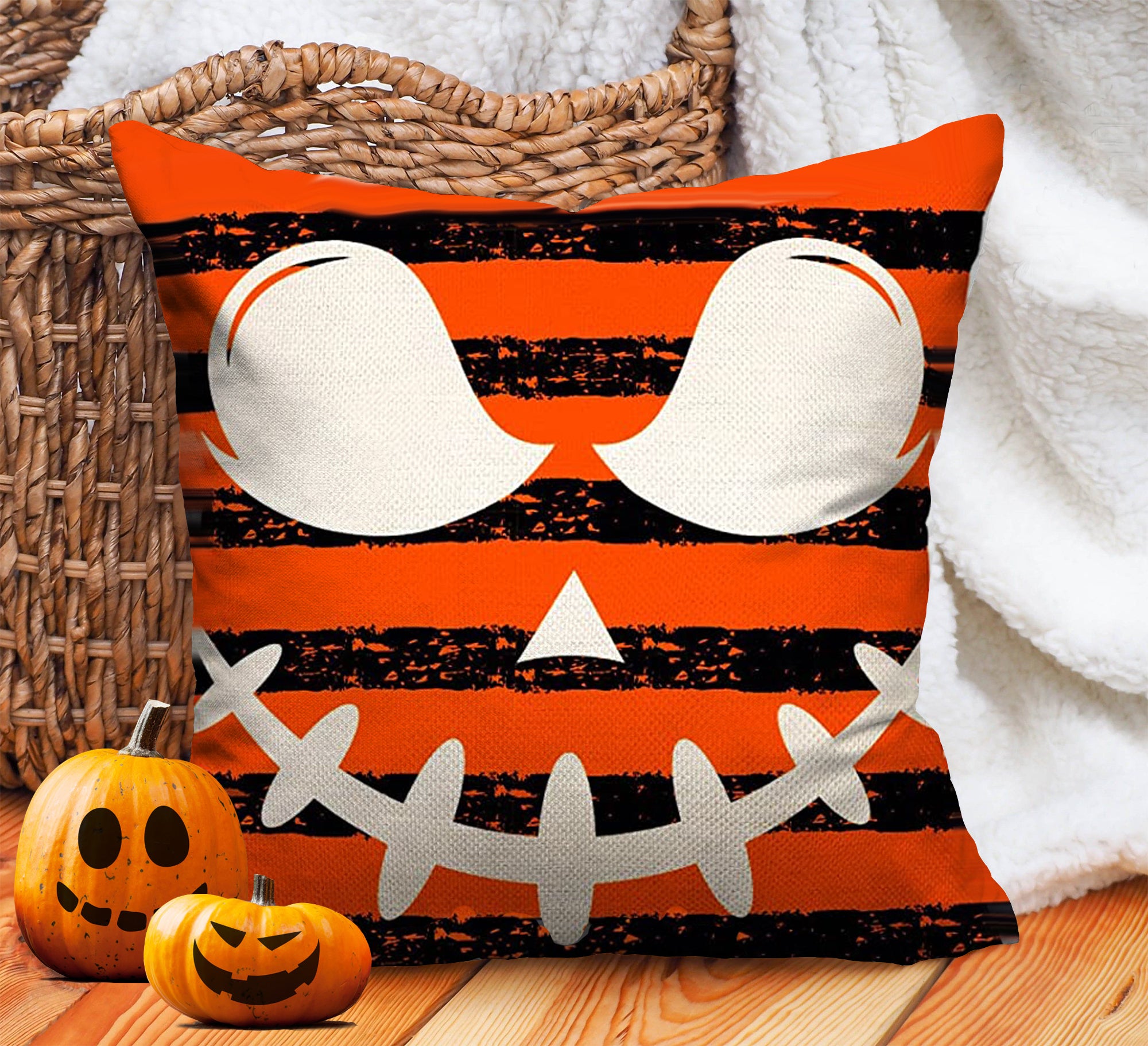 Spooky Smiley Black Orange Stripe Halloween Throw Pillow