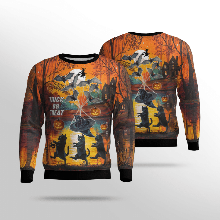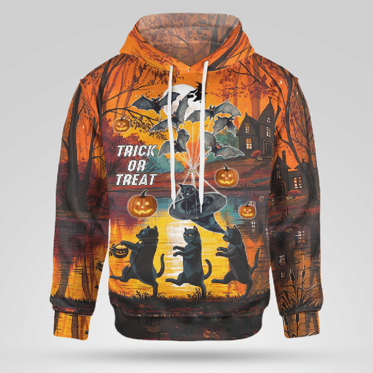 Spooky Trick Or Treat Black Cat Orange Halloween 3D All-Over Print Unisex Hoodie