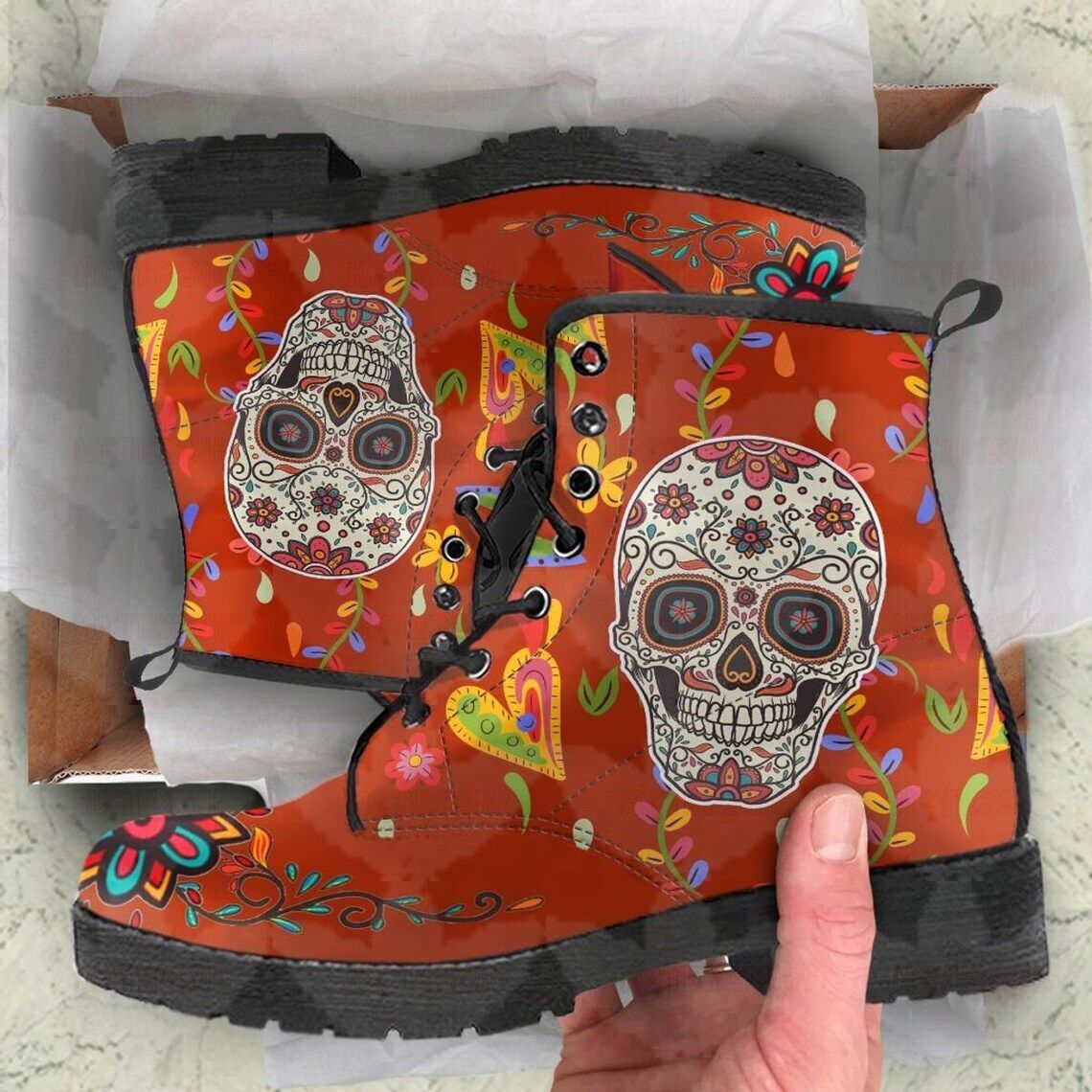 Sugar Skull Orange Combat Boots – Day Of The Dead Hiking Boots – Halloween Shoes – Casual Boots Lace Up Vegan Leather Boots