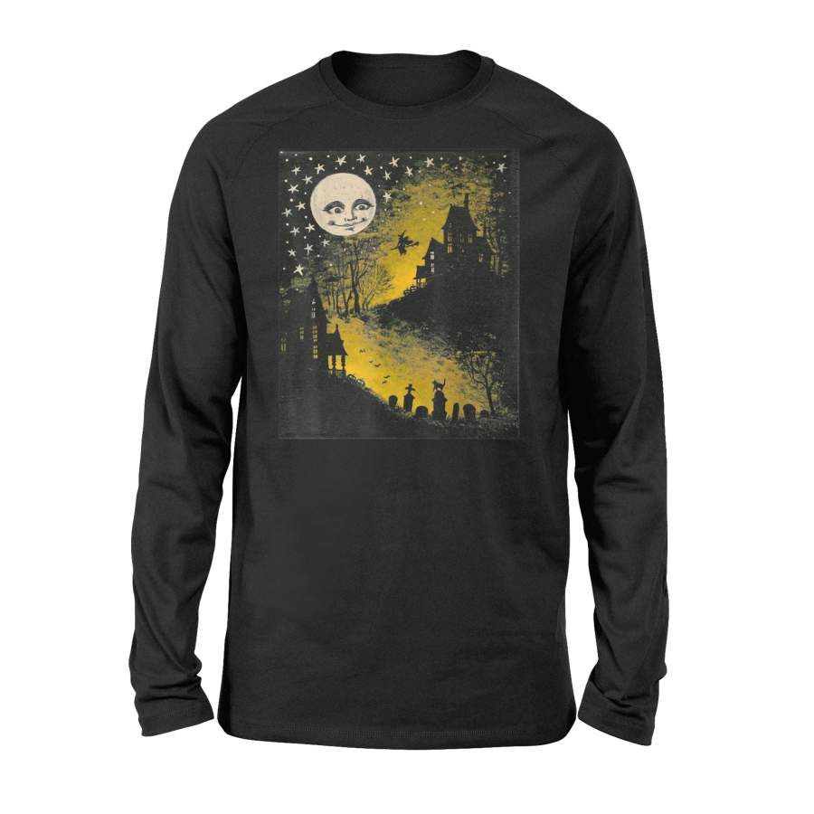 Sweet N’ Spooky Vintage Style Halloween Moon, Witch T- Shirt – Standard Long Sleeve