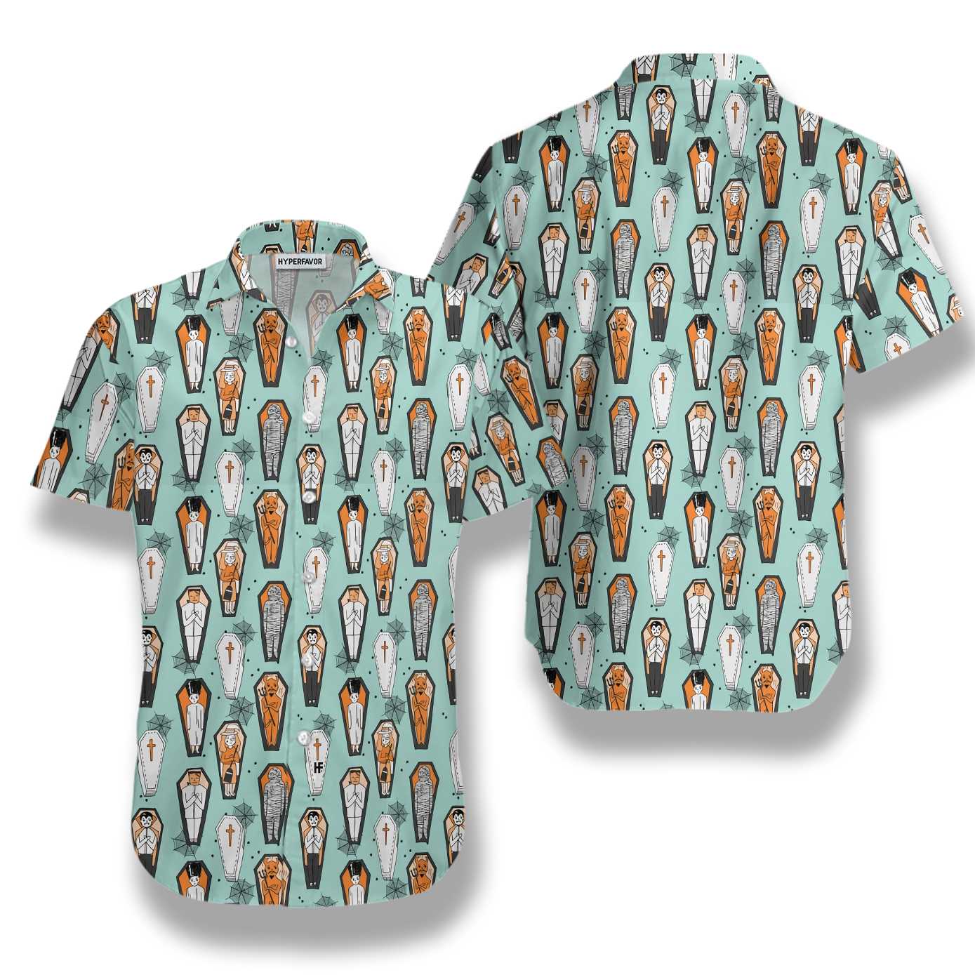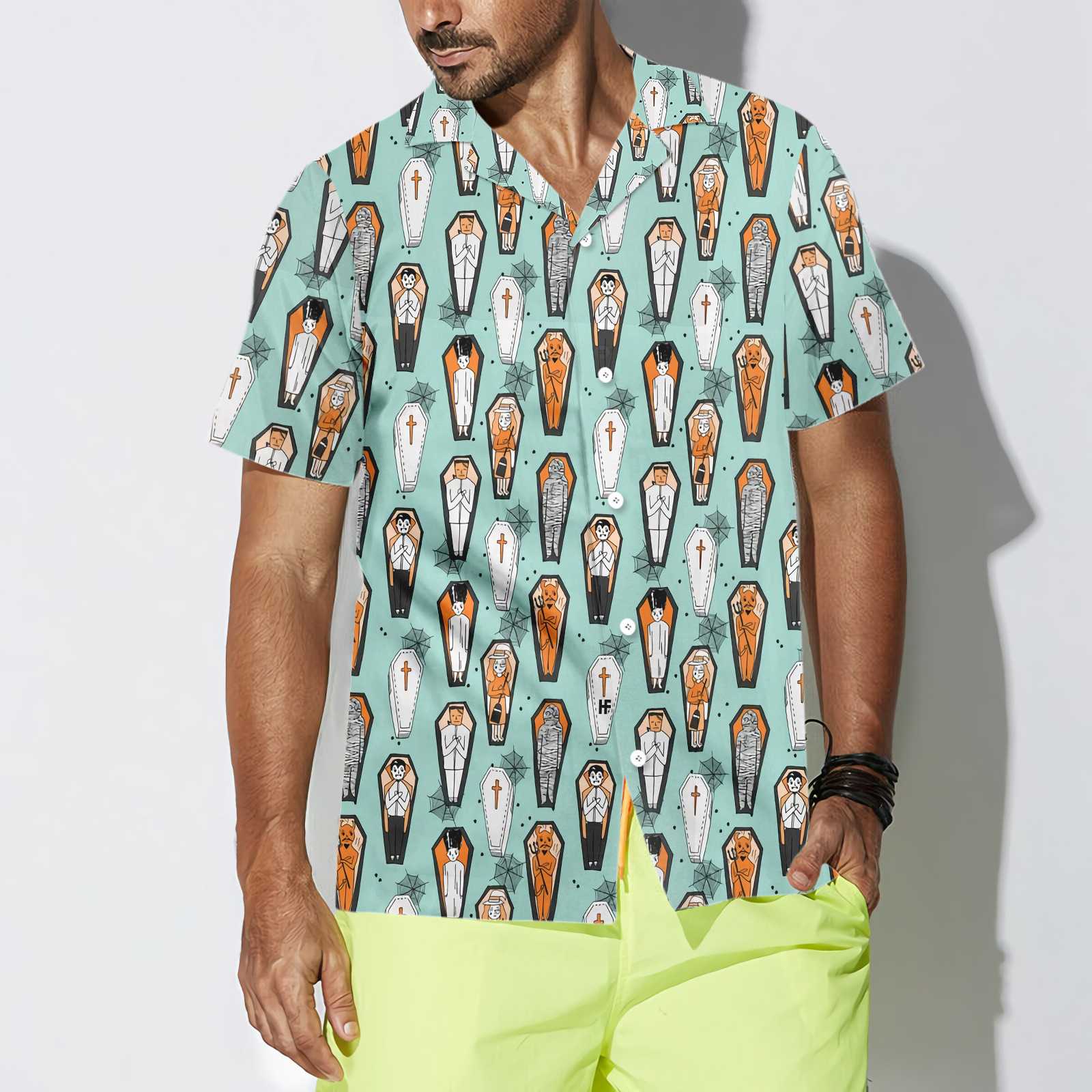 Vampire Coffins Halloween Shirt For Men, Arctic Blue Coffin Pattern Hawaiian Shirt