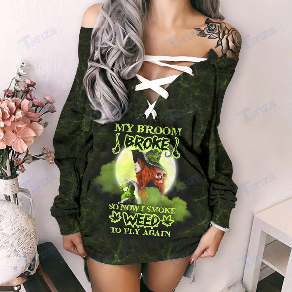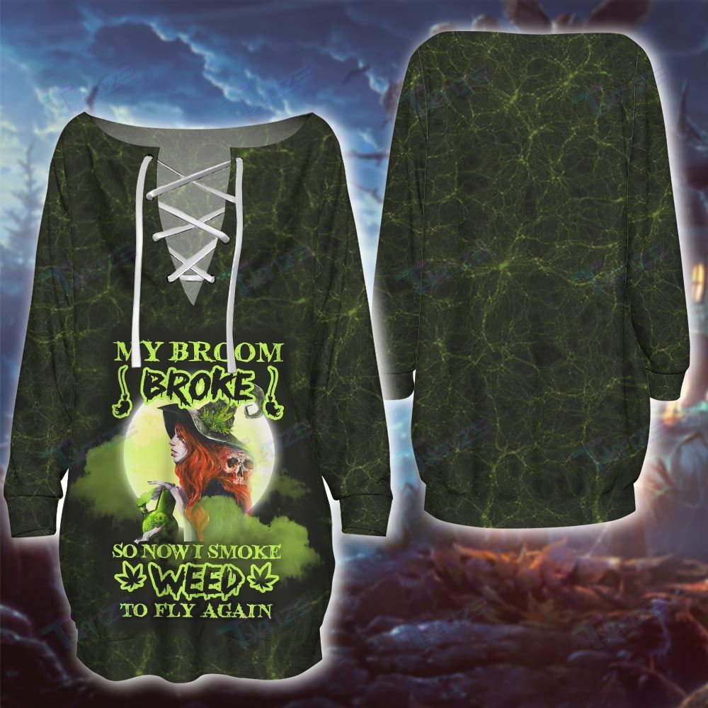 Weed Halloween Witch My Broom Broke Lace-Up Criss Cross Sweatshirt Dress